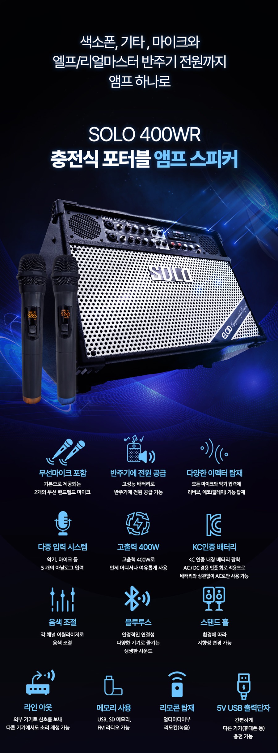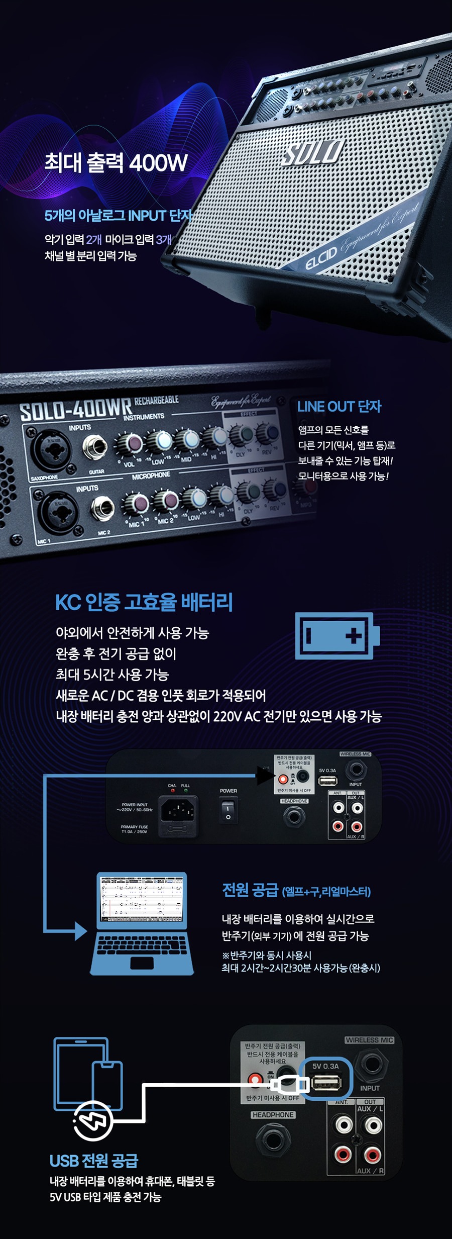 엘시드 ELCID SOLO-400WR(무선 마이크 2개 포함) 충전식 / 전기식 / 반주기(엘프, 구리얼마스터) 전원공급 / 기타 / 색소폰 / 블루투스 / 공연 / 행사 / 버스킹 / 출력 400W-