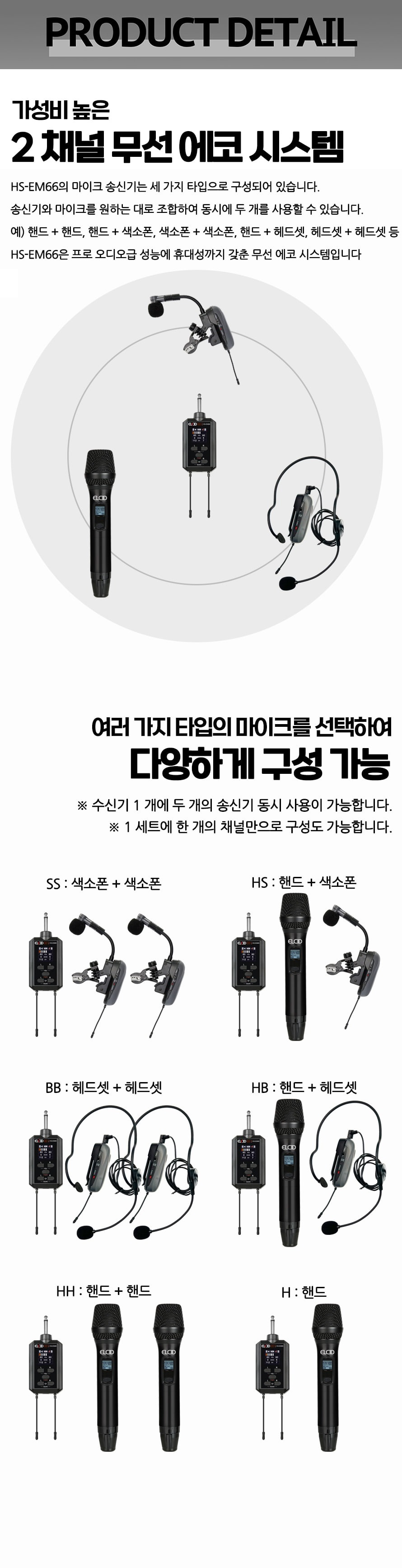 엘시드 에코 마이크ELCID HS-EM66 HS(핸드+색소폰) 2채널 무선 에코 마이크 자체 이펙터 강연 노래교실 공연 인터뷰 연주회